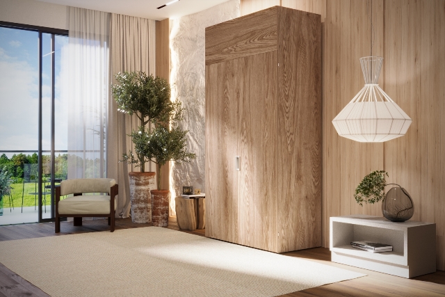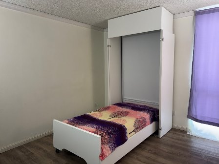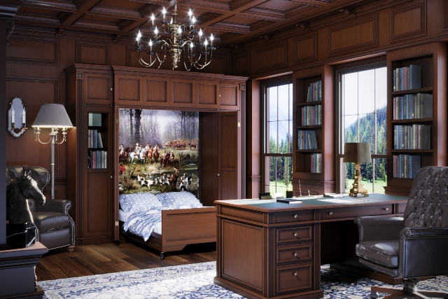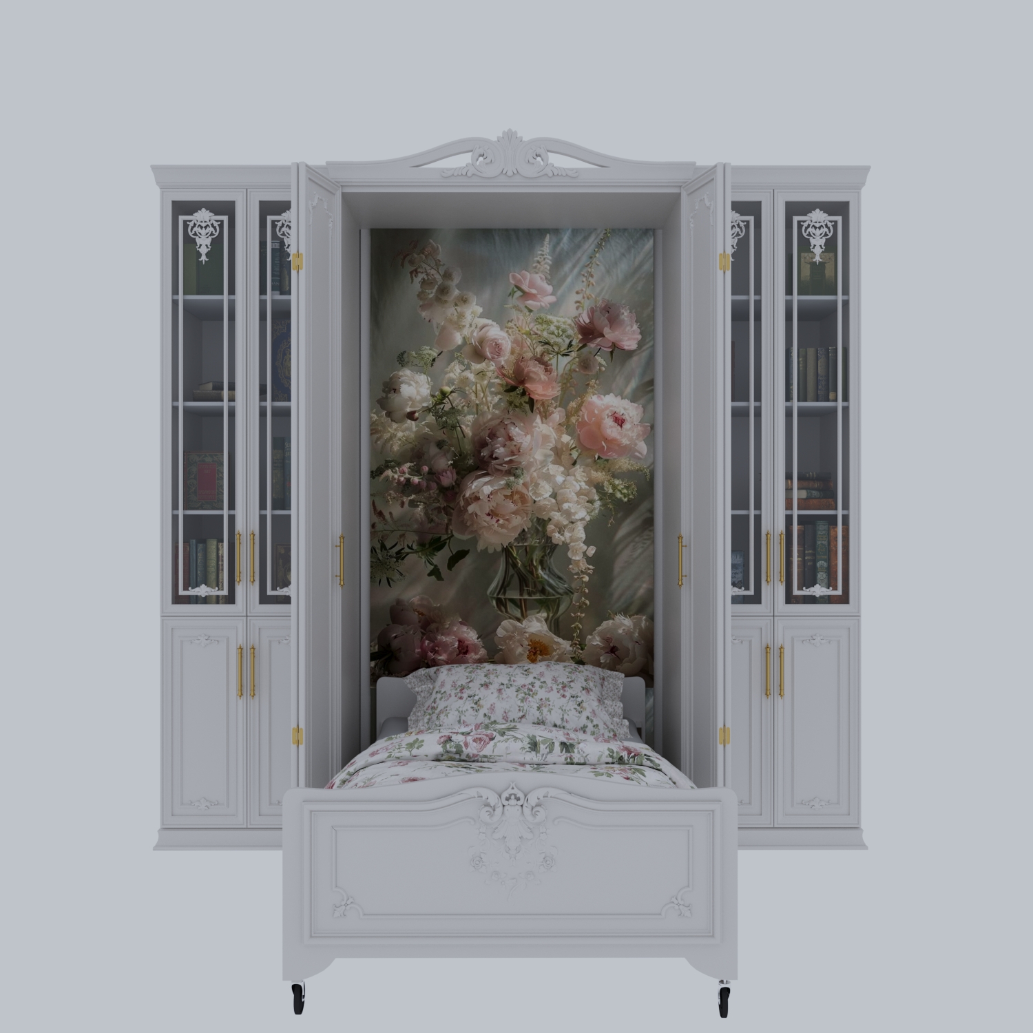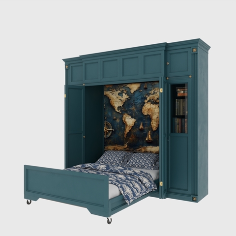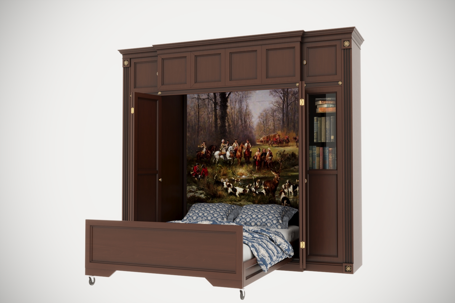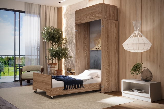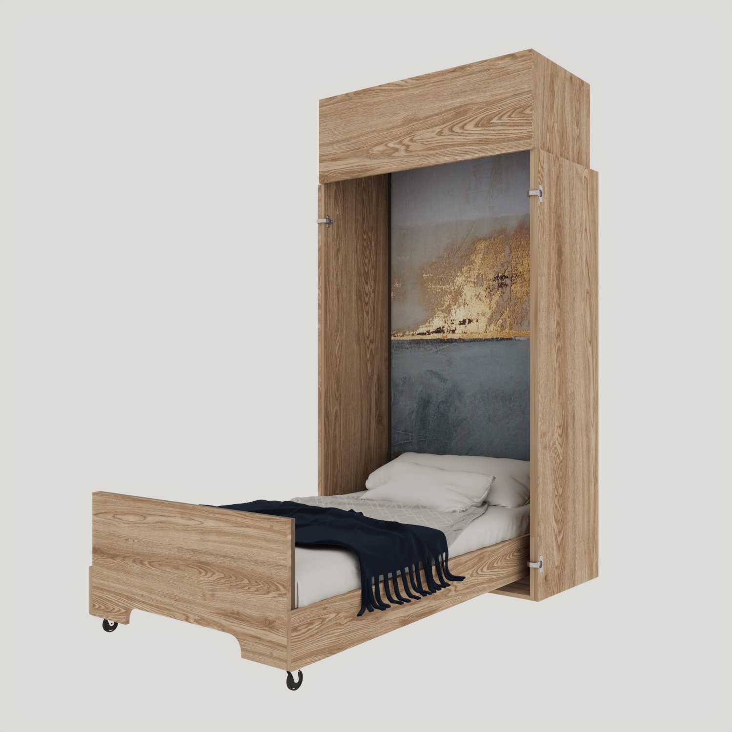 The basic configuration of the A-bed consists of a single bed (Twin) measuring 79 x 39.5 x 18.5 inches with an 8-inch mattress and a double-door wardrobe measuring 94.75 x 75 x 24.5 inches, into which the bed automatically folds. The bed is controlled by a remote control (two included). Power is supplied by a 110V network (cord included).